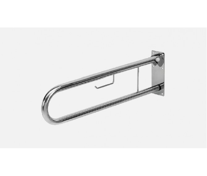 Apoio articulado para sanitário com suporte para rolo de papel higiénico, fabricado em aço inox.