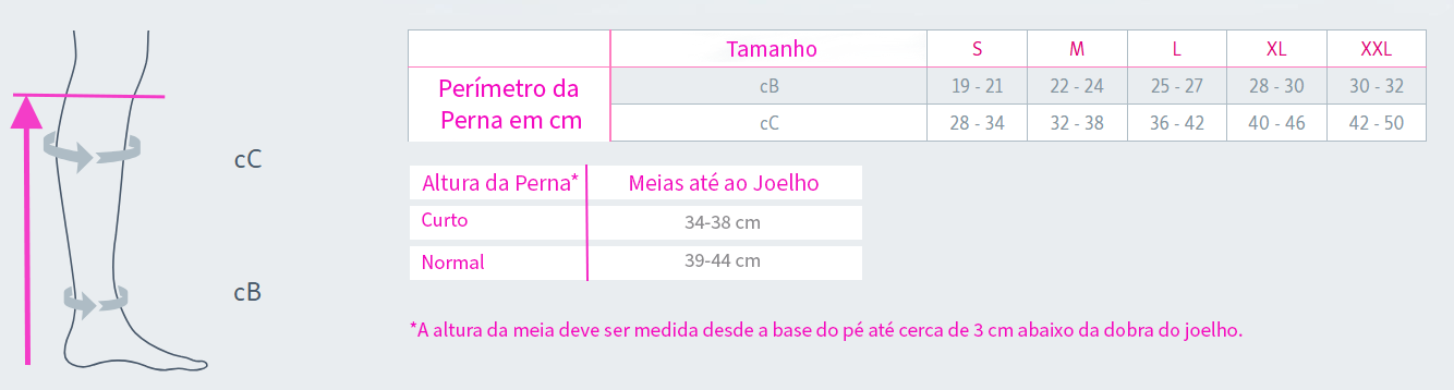 As meias elásticas são um dispositivo médico no qual só com tiragem de medidas se consegue ter a compressão clinicamente correta em toda a perna. Usar um tamanho maior ou menor que o correto só fará o utente piorar, correr riscos desnecessários e daí surgirem problemas graves que são totalmente evitados com o uso do tamanho certo! Não brinque com a sua saúde! Consulte a tabela de medidas do artigo. As medidas devem sempre ser tiradas logo ao início da manhã, a pessoa deve estar de pé, com as pernas afastadas e o peso distribuído pelas duas pernas. Para uma meia até ao joelho, devem ser tiradas 3 medidas: Tornozelo, barriga da perna e a altura até ao joelho (ver na tabela de medidas o local onde deve tirar essas medidas). Para medir a altura de perna deve estar de pé e medir a altura da perna pelo interior da mesma, desde a base do calcanhar até dois dedos abaixo da dobra do joelho.